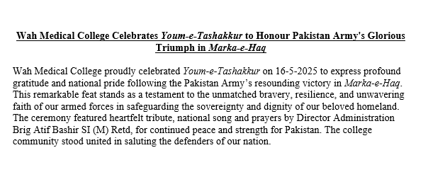 • Wah Medical College Celebrates Youm-e-Tashakkur to Honour Pakistan Army’s Glorious Triumph in Marka-e-Haq